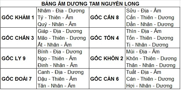 LƯU Ý: trong bảng "âm dương tam nguyên long" không có số 5, bởi sao 5 nằm tại trung cung. Nếu trường hợp gốc của Linh thần hay Chính thần chính là sao vận số 5 (ví dụ xem bảng trên, giả sử nhà tọa Tị hướng Hợi) thì giữ nguyên âm dương của sơn/hướng mà phi thuận hay phi nghịch (ví dụ nhà tọa Tị - Nhân - Dương thì bỏ vào trung cung phi thuận mà không quan tâm tới gốc số 5 của vận nữa).